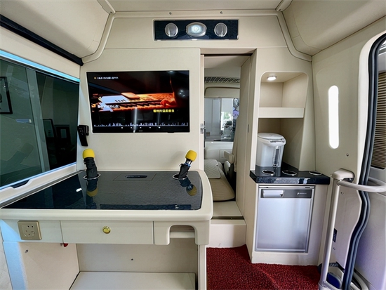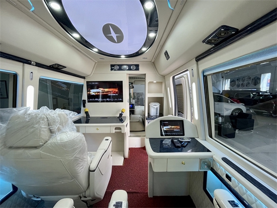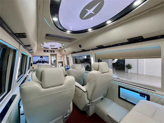 丰田考斯特改装11座增加隔断的设计是突出房车的一个最基本的标志,增加隔断的设计使得丰田考斯特改装11座房车的乘客席相分离。在内饰的设计就像之在装饰自己的房子,温馨的布局隔断上还可以增加一些美观的设计,显示屏,电子时钟美观实用而又简洁大方, 内饰相对于豪华和奢侈更加注重的是简洁中的大方和尊贵。