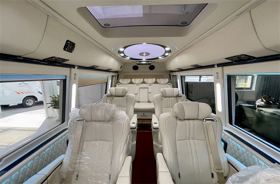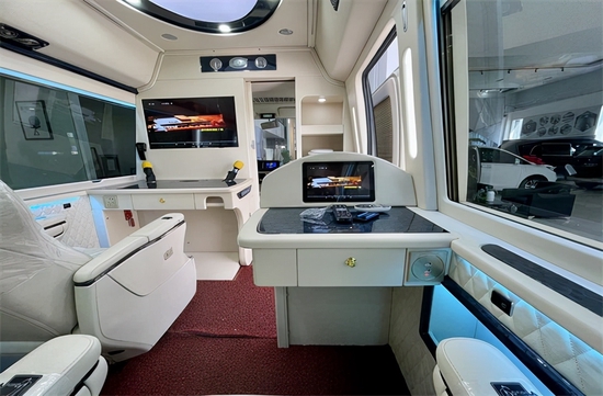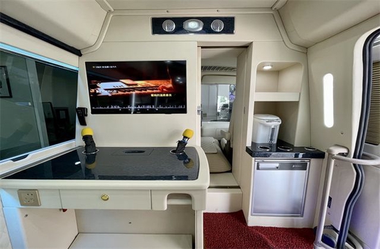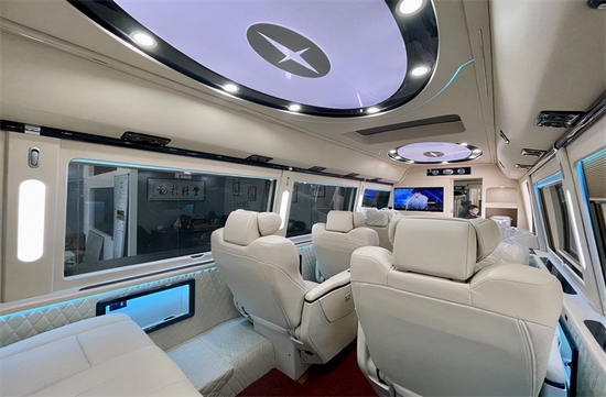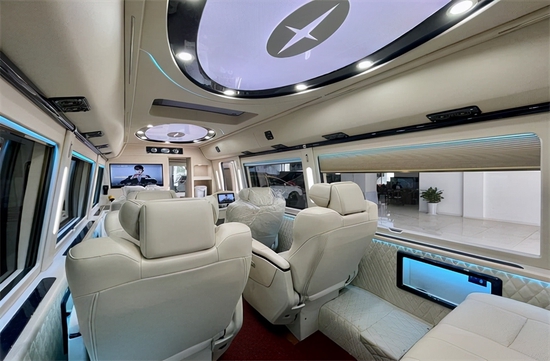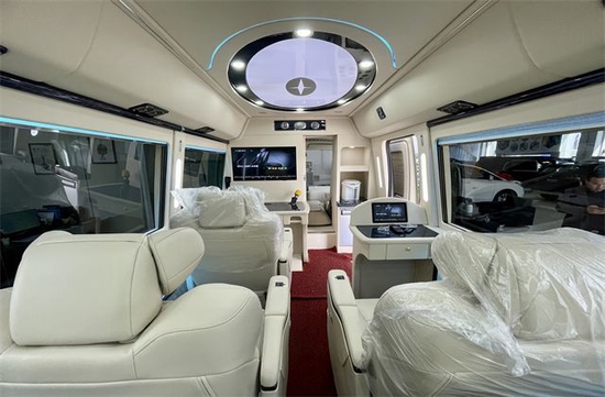 卡拉ok多媒体系统,高清网络电视,5.1声道环绕音箱,电加热烧水壶,50升冷藏冷冻的冰箱。以及豪华办公桌,车顶是a380空客顶,搭配炫彩氛围灯光,全车配备电动私密百褶窗帘。尾部选用四联排电动座椅支持一键放平豪华大床。