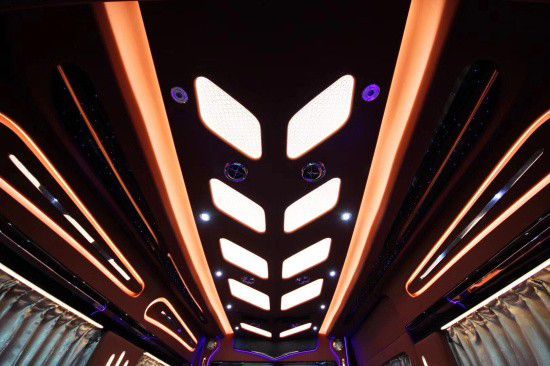 奔驰斯宾特乘客舱一般都是7加2的布局,中间以隔断将前后分开,隔断上镶嵌一台40寸曲屏电视,下方吧台兼容2个电动收缩反向座椅,以及BOSE音响等多媒体设备于一体,来凸显奔驰斯宾特的奢华配置。后排两张进口航空座椅,一应功能俱全,后排则是一张可放平的沙发床是座椅,功能上这个大家都懂的!