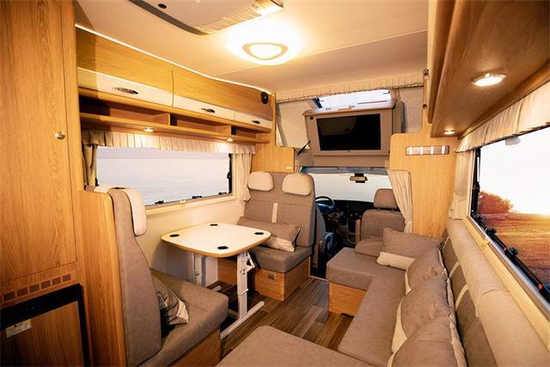 U型沙发并排乘坐3人不在话下,加对面会客区可以临时变为商务会议室,用途多变;当变床后增加车内人员休息空间的同时又让布局一目了然;旁边配有滑动盖板可放一些小物品。全车配有多组220V五孔插座及USB充电接口,为行车途中手机等小型电器冲突提供了便利。
