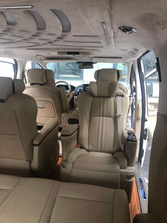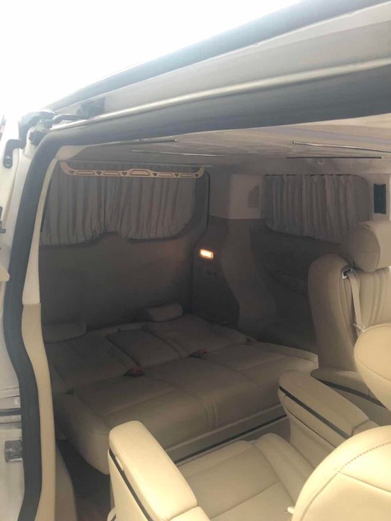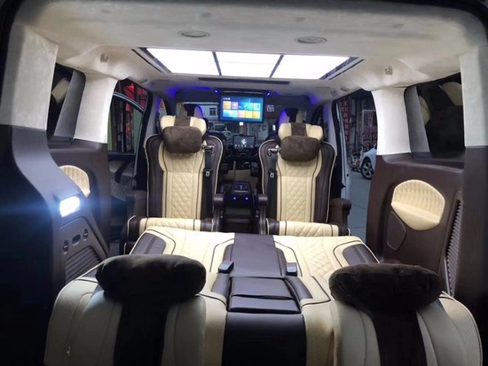 途睿欧的前排座椅,原车座椅座椅是手动的,而且比较单薄,主副驾驶中间也没有扶手冰箱,改装升级之后前排座椅变成了丰田埃尔法款式的座椅,具备了电动调节功能,增加了埃尔法睡眠头枕,主副驾驶中间安装了中央扶手冰箱。改装之后主副驾驶乘坐感觉更加柔软,电动调节更加方便的变换座椅角度,中央的扶手冰箱可以让乘坐人员的手臂更加舒适的放置,主副驾驶后背还增加了像奔驰V260一样的可隐藏式折叠桌板,仪表台进行了真皮软包。