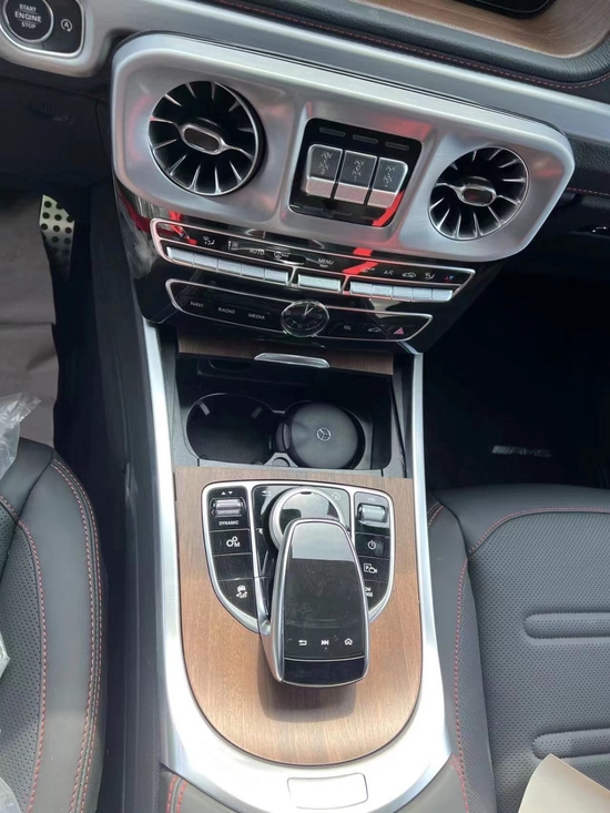强劲的楔形特征以及醒目的奔驰车标使其在静止不动的时候都能让人感受到他的奔放气。 国六奔驰G500车内采用深色调与桃木装饰,黑色真皮运动座椅非常舒适,方向盘以高档真皮包裹装饰,触感极其细腻。配有桃木装饰的操控台,稳重大气,同时提高了整体的质感。各种功能按钮应有尽有,丝毫不次于豪华轿车的功能。