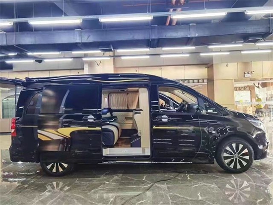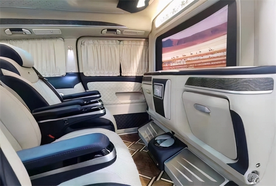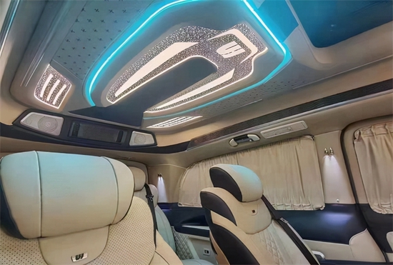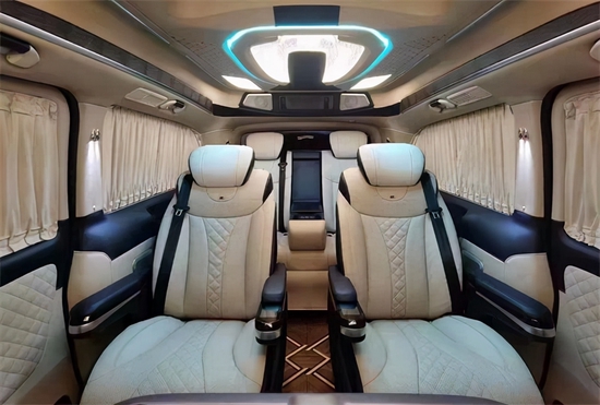二排座椅旋转过来可以与第三排形成对坐,可以满足家庭出行时的娱乐需求以及商务出行中的会议谈判等需求。航空桌板带杯托、无线充电,高清液晶电视、柏林之声音响,还有各种人性化配置,还有各种人性化以及娱乐性的配置。不管是接待还是旅游,都很实用。顶部搭配层次分明的光线灯,配上繁星点点的满天星和横条灯带,既梦幻又高级。一切的搭配都只是为您展示这款奔驰威霆巴赫般的奢华与不凡。同时本款威霆高顶7座高端私人定制改装商务车,不仅在视觉上还是触觉上都能让乘坐者感到身心愉悦。