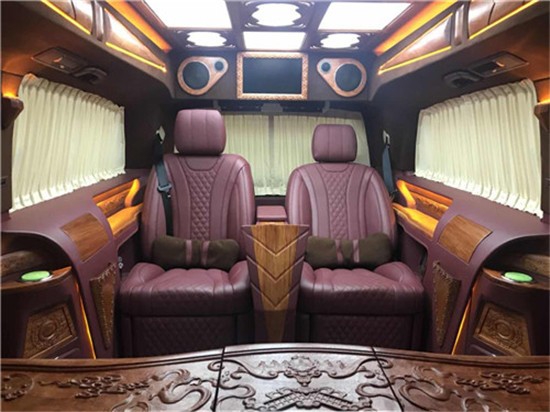 奔驰V250改装红木总裁版贵宾舱装饰极其奢华,宛如皇家宫殿,舱内采用大量缅甸黄花梨装饰,并纯手工打造精美雕花,古色古香,进口奔驰V250商务车又仿若一方富甲书房。进口奔驰V250红木总裁盛世祥云版设计理念为高端人士商务用车之选,内饰科技感十足,座椅采用4+2隐藏六座设计,在车身长度5370mm的基础上更充分利用车内空间,在32寸电视周围用黄花梨木进行装饰,第二排座椅采用的是GL450反向座椅,可语音控制电动调节。指纹式保险柜,隐藏式ipad电脑,车内饰烟灰缸,全部都用红木和鳄鱼皮进行打造,细节,工艺,无不体现此车内部的豪华程度,更有车载WIFE,电子狗等系统。
