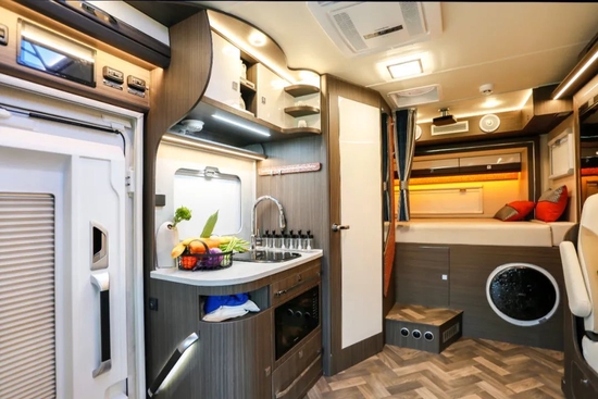 车内厨房区部分,一整个的厨房台均做了圆角处理,安全性和观感都有体现。最上方的储物柜和下方做了侧板连接,整个厨房台形成一个整体。此处配备有全铝碗碟收纳架、多功能微波炉、电磁炉、进口带盖洗菜盆、科勒水龙头等设施,配置上也是很齐全的。