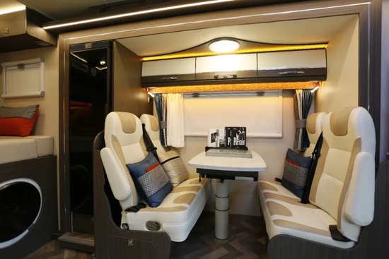 会客区部分,座椅均使用乘用车可调节座椅,乘坐体验是车不可或缺的一部分。中部的餐桌为进口多级多向可调节升降餐桌,并且带有一个笔记本收纳柜,这还是很少见的。顶部照明灯处加入了黑白二色交接的设计,车内类似的小细节还不少,不断积累出优秀的整体时尚感。