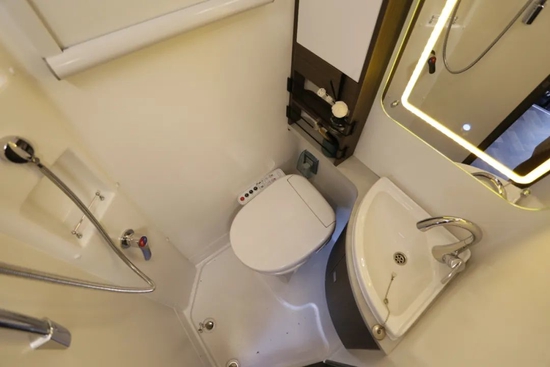 车内设立了独立的整体式复合防漏水浴室,空间上一个人使用还是没啥问题的。配置方面,特别选用了进口水封电动粉碎式座便器+进口智能马桶盖,属于是用过的都说好的组合。此外多功能豪华卫浴系统、LED发光卫浴镜、毛巾架、储物柜等均有配置。