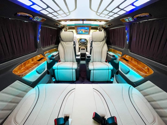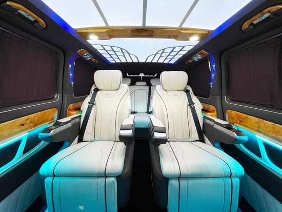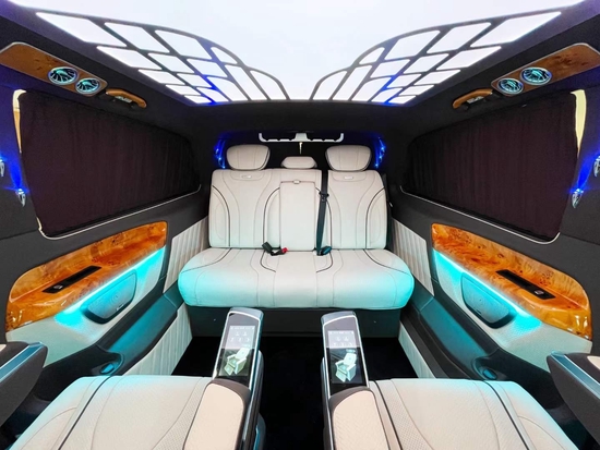 2022新款奔驰威霆改装平顶七座豪华商务车全新升级。改装后座椅的外形、温馨程度、功用能否齐全是一辆商务车改装很重要的方面。新款奔驰威霆改装商务车的座椅扶手上有触手可及的控制区,具备通风、加热、按摩、以及可前后调理移动座椅,调理适宜自己的位置,让乘坐愈加温馨;椅背放180度,可作为暂时休息的“座椅床”;动脚托可根据自己的需求和气息调整。搭配上璀璨的氛围灯光以及定制款的顶灯设计让我们如同处在梦境中一般。奔驰威霆平顶7座商务车后舱第三排座椅采用的是三联座沙发,可通过旁边按键一键快速变成舒适大床,后排采用隐私玻璃使后排的私密性更好,在这样的私密空间中可进行商务洽谈,也带给您一个豪华、私密、舒适的MPV体验感。