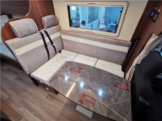 会客区,一侧的L型沙发座椅+升降桌可通过简单的操作,与右侧单独座椅联动,变形为可供1-2人使用的床铺。由于会客区其实占据了整个车身中部,所以空间上来说很充裕,坐在左侧看电视也很方便。