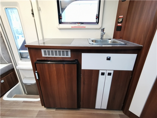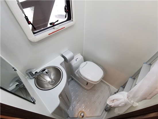 厨房区域位于上车左侧,空间较大,配备了电磁炉、房车专用无盖水槽+固定式水龙头,完全满足旅行途中做饭所需。车内配置了宏都房车专用顶置空调、弗罗斯特冰箱88L、燃油暖风机、24寸壁挂式车载网络电视,以及埃贝赫燃油暖风机+特鲁玛B14电热水器。