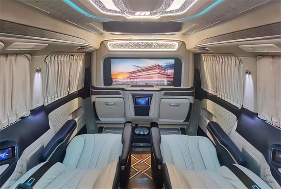 二排座椅旋转过来可以与第三排形成对坐,可以满足家庭出行时的娱乐需求以及商务出行中的会议谈判等需求。航空桌板带杯托、无线充电,高清液晶电视、柏林之声音响,还有各种人性化配置,还有各种人性化以及娱乐性的配置。不管是接待还是旅游,都很实用。顶部搭配层次分明的光线灯,配上繁星点点的满天星和横条灯带,既梦幻又高级。一切的搭配都只是为您展示这款奔驰威霆巴赫般的奢华与不凡。同时本款威霆高顶7座高端私人定制改装商务车,不仅在视觉上还是触觉上都能让乘坐者感到身心愉悦。