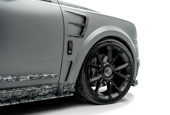 除去车头,MANSORY50thU·A·ECullinan车身、车尾也是极尽“重工”:大到侧裙、后保险杠、顶部扰流、尾翼、后置扩散器;小到翼子板扩展件、后视镜壳、门把、行李箱扰流盖板无一例外都是雪花纹锻造碳材质。原本高冷绅士的库里南经过这番精心修饰,瞬间添了许多动感时髦。