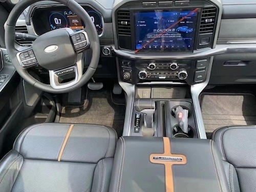 2021款福特F150XLT中控区域布局清晰合理,大尺寸的液晶显示屏提升了其科技感,多功能方向盘,给人一种强烈的驾驶冲动,大面积皮革材质的包裹,加上镀铬装饰的点缀,从而营造出了一种舒适豪华的内饰氛围。