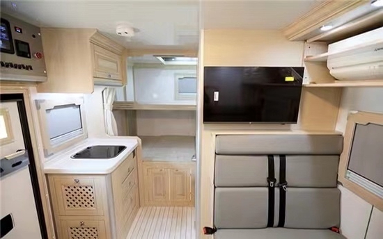 车内实木(美国红橡)搭配拉丝铝板家具+环保型房车专用柚木地板革;布局方面,采用了会客区对卡座沙发+气动升降餐桌+实木组合式橱柜+卫生间+车尾横置上下床的布局结构设计,全车的储物空间非常丰富,对于长期户外旅游者来说实用性高。暖色系氛围更贴近居家效果,让成员即使在外旅行也能感受到住家的感觉。会客区真皮软包对卡座沙发满足4人乘坐,卡座沙发搭配气动升降餐桌可变为一张沙发床;固定式安全带保护行车途中乘客的人身安全。坐垫厚实,弧形靠背也提供一定的支持感,整体来说乘坐舒适感还是不错的;沙发内侧墙壁2个独立外推窗,提供采光及通风换气效果;三菱重工变频空调(单冷)制冷效果快,可手动调节温度;吊柜方便日常收纳物品。