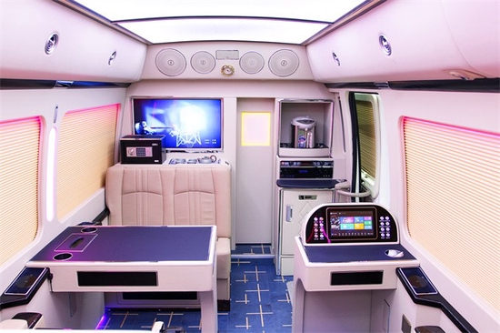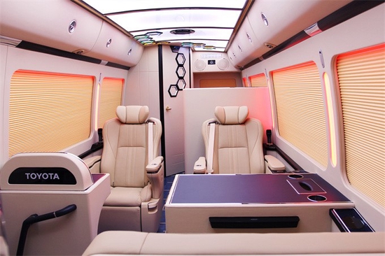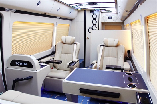 丰田考斯特然不失纯朴!在内饰方面所做的文章就更加足了!里面咱们可以把所有的东西更换一个遍,让他再也找不到原车内饰的影子,这里面包含了丰田考斯特的操控台内饰,顶棚、侧壁、地板、座椅玻璃、窗帘、音响、灯光等等一些列的内容!座位数同样也发生了不小的变化,根据咱们实际的用途,咱们可以划分为丰田考斯特通勤版车,一般所包含的座位数为丰田考斯特23座、20座19座像这一类的车子一般改装都相对来说比较简单一些,操控台一般都加装一个导航DVD系统,附带着来一个倒车影像。主要是司机操控比较方便,毕竟这个车子还是比较长的,这样就提高了倒车的安全系数,顶棚上呢一般加装一个19寸的电动DVD显示器,方便在上下班的路途过程中看看电影播放一下公司的资料。