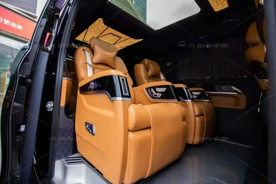 奔驰V260L红木总裁盛世祥云版设计理念为高端人士商务用车之选,内饰科技感十足,座椅采用4+2隐藏六座设计,在32寸电视周围用黄花梨木进行装饰,第二排座椅采用的是GL450反向座椅,可语音控制电动调节。