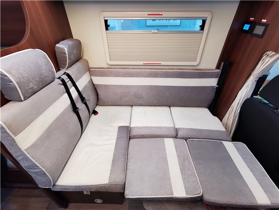 会客区,一侧的L型沙发座椅+升降桌可通过简单的操作,与右侧单独座椅联动,变形为可供1-2人使用的床铺。由于会客区其实占据了整个车身中部,所以空间上来说很充裕,坐在左侧看电视也很方便。
