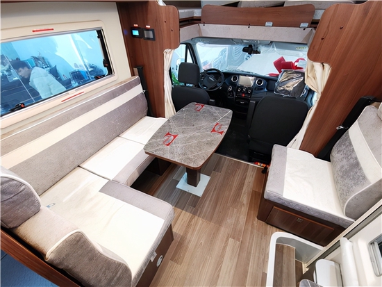 整车车内风格清新自然,多采用生态板材家具,简约自然、清新舒雅。搭配房车专用地板革、组合式吊柜,居家空间在暖黄色的氛围灯的衬托下,显得尤为浪漫温馨。