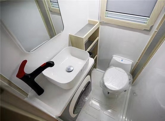 卫生间采用干湿一体式设计,内部配备赛特福德马桶、洗手池、梳妆镜、换气扇、淋浴花洒等;大宇3kg洗衣机免去了手洗的时间,提高了生活效率;水路系统方面,400升净水箱、75升灰水箱。整车上下水系统做了防冻处理,更好的适应极度严寒等恶劣环境。
