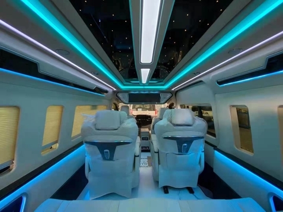 整车改装是奔着豪华舒适去的,进入车内感觉不一般。在娱乐系统方面,24寸无线吸顶娱乐电视机带卡拉OK功能,看电视,听音乐,声效级别满分,驾驶舱座椅靠背桌板,能当电脑桌使用,各种线条氛围灯带随处可见。整车除了具有商务功能化,也具有了娱乐功能。