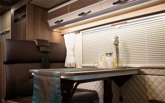 会客区采用双人对坐卡座设计,可以向外侧拓展开来,将餐桌向下可与卡座拼接变为一张1900*945(mm)的沙发床。上方设计有一组吊柜,可以放置一些物品,配合我们尾部储物仓让我们整车的储物空间达到惊人的2500L;左侧拓展出去以后中间有了一块非常宽敞的空间。内饰采用了棕色木纹加米色木纹的装饰,沉稳内敛十分讨喜。