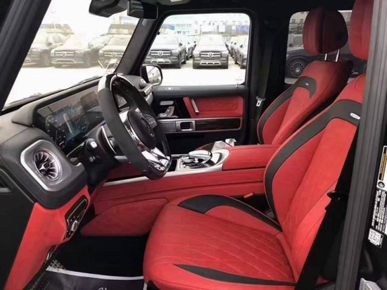 2022款奔驰G63它硬朗的方盒子造型,没有多余的弧度、没有任何曲线,眼光所及满是平直锋利的线条,就连车顶上的导雨沟槽,也是沿着车顶周围一圈,分外焊接上去的金属槽,车门搭钮更是绝不虚心,硬挺挺地屹立在门缝之外,外凸的轮拱、造型如同 梯形的引擎盖。21款奔驰G63黑/红色内饰 金属漆 碳纤维内饰 AMG专业性能碳纤维皮革方向盘 22寸磨砂黑轮毂 AMG红色卡钳 AMG碳纤维发动机盖 AMG独家大内饰包[独家Nappa皮革菱形座椅和Nappa皮革内部装饰件/主动式多轮廓前排按摩椅/前排座椅快速加热功能/前排通风座椅] (手工Designo菱形格座椅 Dinamica麂皮顶棚 Nappa仪表台真皮包裹 无框后视镜) 暗夜增强包(黑色后视镜备胎罩保险杠,黑色前后保险杠,黑色防护刷,青铜格栅,有色前指示灯头灯和尾灯。