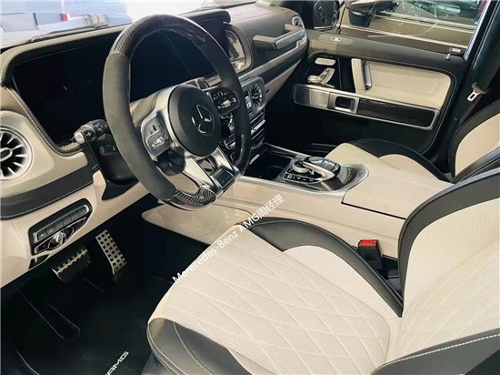 22款奔驰G63蓝缪斯限量特别版的内饰即豪华又充满科技感,中控台多处均采用碳纤维材质覆盖,带彩色TFT显示屏的AMG仪表盘、AMG主菜单和单独的挡位显示器以及采用白色照明的AMG门槛。名贵的选材及精湛的打造都令人拍案叫绝。双12.3英寸贯穿式的显示屏营造出了浓郁的科技氛围。当然了,经典的“三把锁”按键自然不会缺席,并且设置在中控台最为显眼的位置。