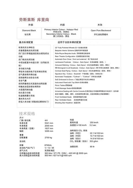 劳斯莱斯库里南(Cullinan)动力方面:V12双涡轮增压发动机采用劳斯莱斯喜欢的“六又四分之三升”排量,最大功率570马力,最大扭矩850N·m,与之匹配的是来自ZF的8AT变速箱,官方给出的0-100km/h加速时间为5.2秒。在当今年代,12个汽缸的尊严感已经屈指可数了,这也是劳斯莱斯的一种精神。