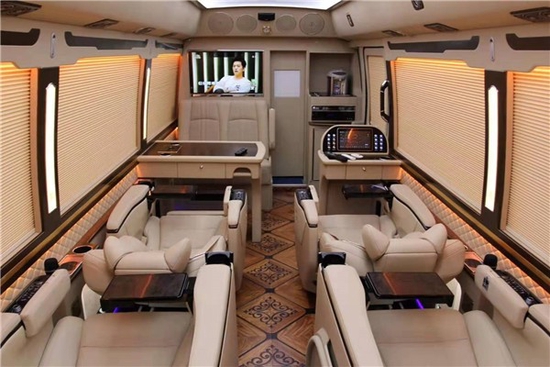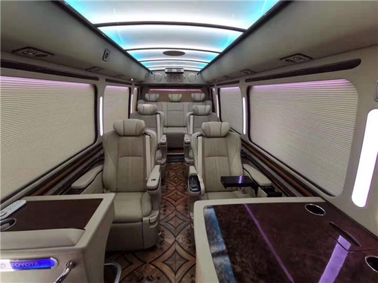 丰田考斯特改装商务车的内饰座椅的数量以及布局的订制,座椅数量从10座到23座不等的设计,由于车内的空间是相同的,座位数量越少,我们在车内就可以有更多的活动空间,或者添置更多的为我们接待或办公的设备。地板或地毯,车载办公桌,侧壁装饰,实木装饰,隔壁板,影音系统,顶棚灯饰,无不流露出尊贵奢华。
