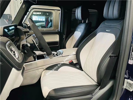 22款奔驰G63蓝缪斯限量特别版的内饰即豪华又充满科技感,中控台多处均采用碳纤维材质覆盖,带彩色TFT显示屏的AMG仪表盘、AMG主菜单和单独的挡位显示器以及采用白色照明的AMG门槛。名贵的选材及精湛的打造都令人拍案叫绝。双12.3英寸贯穿式的显示屏营造出了浓郁的科技氛围。当然了,经典的“三把锁”按键自然不会缺席,并且设置在中控台最为显眼的位置。