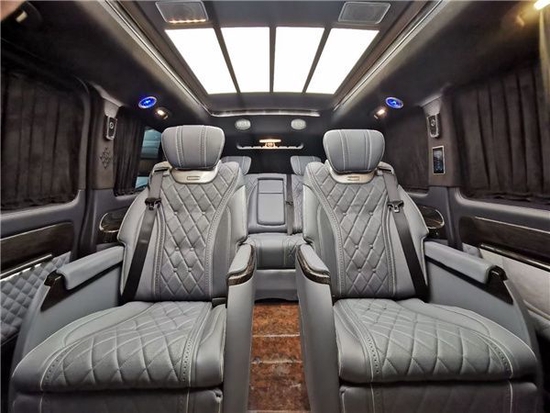 整车做了Bose音响环绕更加有品格,顶部28寸的半隔断电视、正副驾驶座椅背后两个独立的小桌板搭配全车的隐私窗帘,给你一个完美的私密环境,顶部做了翻毛皮的处理,触感更好,观感更美,全车铺设高光镜面亚克力地板更加凸显奢华。