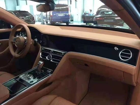 宾利飞驰大量深胡桃木和真皮的运用,打造出了一个十分高贵和精致的氛围,看起来非常的高档舒服。三幅式双色真皮镶边方向盘,手感舒适十分大气,显示屏是可以旋转的,拥有了满满的科技感,百年灵时钟的配备,再一次凸显了它的豪华感。