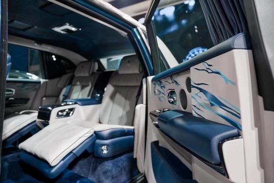 劳斯莱斯流光熠世幻影车型采用人体工程学电动座椅,椅背可调动调节倾斜27°,腿部支撑则可电动升高68°,同时配备了可提升30°的脚托,使乘坐体验自然而舒适。座椅提供海军蓝色/贝壳珍珠色双色拼接的真皮座椅,并可自由选择深/浅两种色调搭配。