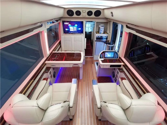 丰田柯斯达的首长席采用的是桃木加真皮包裹,真皮与座椅所用相同,均为意大利进口头层牛皮,首长度右侧为秘书席,配有大屏中控系统,可控制全车灯光、音响、空调等电子设备。司乘区之间采用集成了影音功能的隔断,中途临时会议、工作安排都很方便。