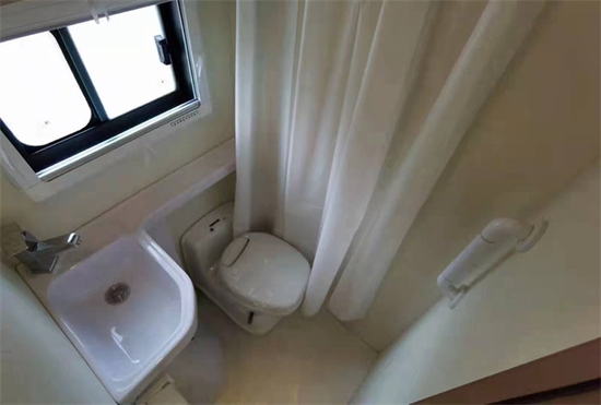 卫生间部分采用防水、耐用性强的复合材料制造,内部配备一体开模的异形洗脸池、赛特福德可旋转式马桶(配18升抽拉式黑水箱)、顶部换气扇、吊柜及淋浴花洒等。水路系统,宾歌CX500配备了160升净水箱(具备免拆清洗,防荡功能)、45升灰水箱(手动/自动排水)。柴油暖风热水一体机。