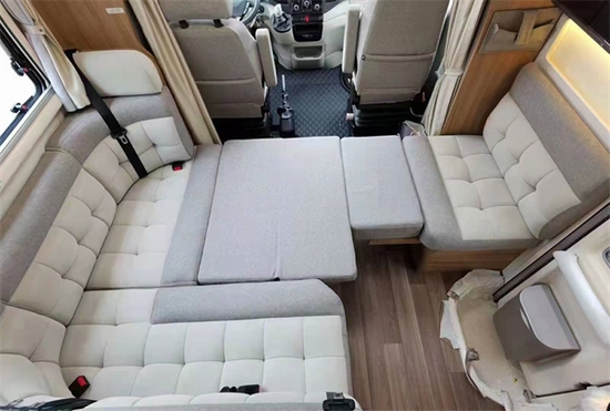 内部的装饰风格也非常的豪华大气,车内还采用了独特的平面地板设计,免去了上下台阶的不方便,也可以避免老人小孩在这里意外跌倒,日常使用更安全。宾歌CX500的内装区别于市面上绝大部分T型房车的内装风格,宾歌CX500给人的感觉更为自然、通透,车内使用轻质板材家具,所有的组合家具全部为自主打造,包含家具的封边、层压和后期的折弯造型等等。布局方面,宾歌CX500采用中前置环形沙发会客区+中置厨房+后置子母床+卫生间的基础格局,虽然布局和绝大部分房车相似,但细节工艺要高出同级别不少车型。