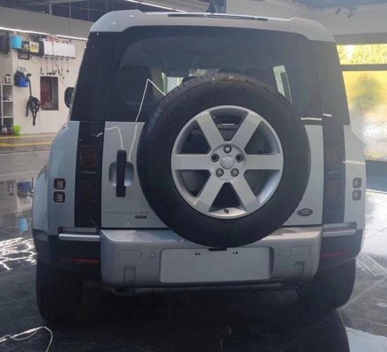 新车车头依旧使用了方方正正的设计元素,方形前灯组内有半圆形光源,前进气格栅的造型设计十分简洁并带有经典的“LAND ROVER”绿色logo,前机盖边缘的“DEFENDER”车型标志也得到了保留。前保险杠下部带有大面积的银色护板,整个前脸的层次感分明,也显得非常厚重。