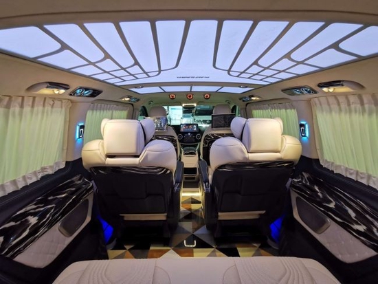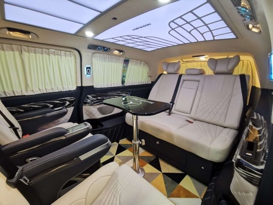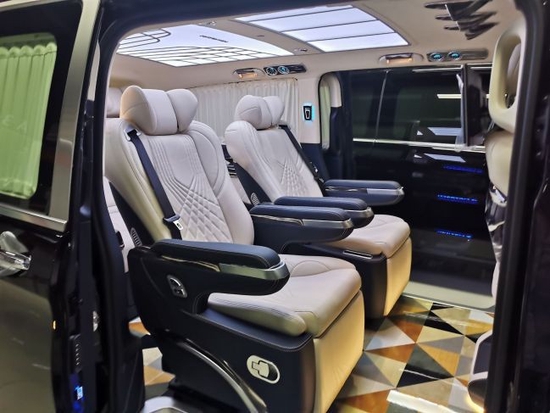 奔驰威霆商务车全体车身尺寸长宽高分别为5370/1928/1880mm,轴距为3430mm。宽阔的空间为前期的改装供给了富余的外部改装空间。奔驰威霆改装平顶无隔断7座,奔驰威霆改装商务车车厢座椅采用了2+2+3的模式,奔驰威霆改装商务车座椅设计得宽大舒适。