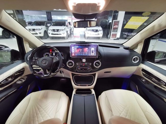 奔驰威霆七座商务车方向盘为三幅运动设计,中控采用了时下流行的V级悬浮屏装配。驾驶室座椅中间还加配了车载冰箱。