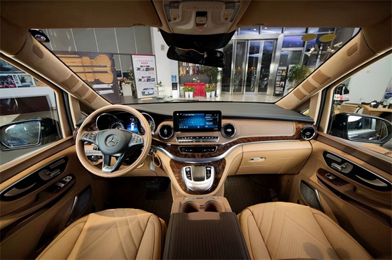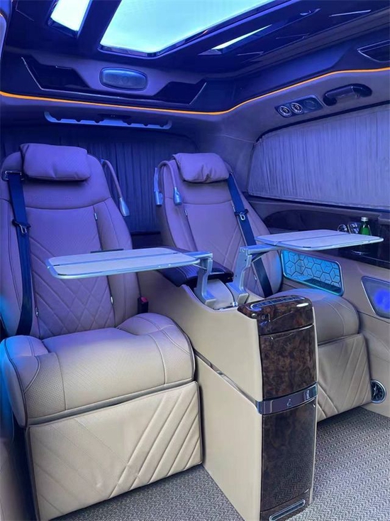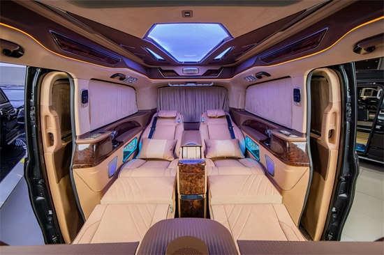 奔驰V260L改装4+2总裁版,驾驶舱与后舱是分隔设计的,形成两个独立的空间。42超大液晶升降电视及多功能吧台,整车环保材质包裹,高光镜面地板铺设,搭配进口马毛地毯。奔驰V260L升级4+2总裁版的吧台与座椅完美结合,下方是隐藏饰酒柜,合理运用了车内的空间,在接待贵宾时不失格调。