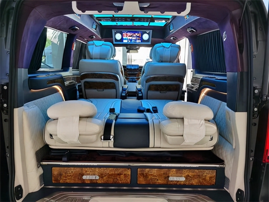 第三排座椅考虑的也是非常周到细致,放下中控扶手可以触屏控制,收起后放第三排,他就是一张双人床,无论是家里老人孩子休息还是公司接待用车,这台奔驰V260L都能很好的胜任。
