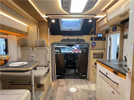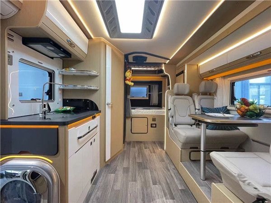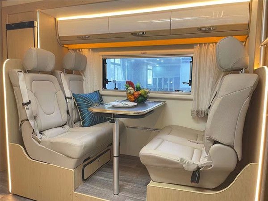 会客区采用对坐式卡座沙发设计,北欧风格的室内设计理念,搭配一张可升降式餐桌,临时可拼成一张沙发床,提供了更多的休息空间。会客厅上方有着一排储物吊柜,方便日常使用。后方则是一台152L赛特福德房车专用冰箱,用以存储食品,排气扇进一步增加了车内的空气流通性。顶部氛围灯营造出了温馨的家庭氛围
