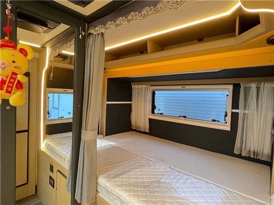 尾部的床铺同样位于拓展舱处,打开前是一张单人床,打开后就是双人床了,床铺三面环窗采光通风都非常棒,顶部设有吊柜可摆放小件行李,床铺下方设计了储物柜可使用。使用舒适、健康的天然乳胶床垫,周围搭配有阅读灯、氛围灯,可满足日常使用。床头出配备有220V电源插座以及USB借口,方便给手机充电。