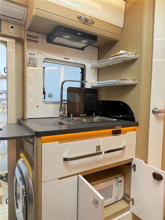 厨房区配置同样十分强大,有带盖式水槽、多功能微波炉、厨房抽油烟机等,车外配置的同样有柴油灶。周围还有储物柜及一组220V电源插座,方便我们日常使用,美的1.5匹家用变频空调,同时全自动洗衣机也在这个位置。