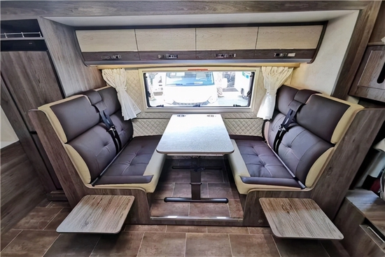 车内部分采用中式的家居风格,更符合中国人的审美,会客厅部分采用的是对座式沙发卡座的设计,直径达到了1.95m做到了行业内最宽,两个成年人面对面坐不会碰到腿。车内储物空间同样十分出色,会客厅上方拥有4组吊柜,后尾部3组,沙发卡座下方同样是储物空间,加上超大的储物仓大概拥有2500L的储物空间可供使用。