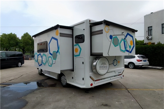 车身两侧分别配有意大利进口菲亚玛遮阳棚、户外抽拉式防风燃气灶、户外厨具储物柜、水电接口等。