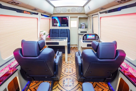 4张埃尔法进口座椅、一张反向双人汇报座椅、一张四连座电动床、隔断电动门、32寸显示器、进口英德尔冰箱、boss音效器、华通丰业16套boss音响喇叭、虎牌水壶、高档办公桌、卡拉OK点歌系统、华通丰业秘书桌及控制面板、A380空客顶灯、金色拼花实木地板、空气净化器、激光消毒器、多种氛围灯、整车桃木装饰、华通丰业无线麦克风、密封玻璃、220V及usb插座、无线手机充电、华通丰业整车真皮包覆等150多项改装项目。