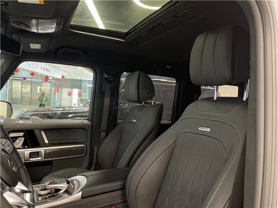 21款奔驰G63中控台配以大量哑光金属材质装饰,提升内饰质感,全新设 计的空调出风口造型精美,内饰最大亮点是全液晶仪表与中控屏组成的双12.3英寸超大连屏,其中液晶仪表可显示三组不同界面,而根据配置的不同,部分车型将配备传统机械式仪表。