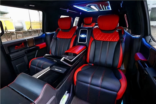 360环景影像泊车系统,后视镜电调。电加热功能。驾驶舱座椅全部Nappa真皮包裹,柔软舒适,中央扶手被一台10.5升的车载冰箱代替,可制冷。商旅房车采用的前后舱隔断式设计,隔断处安放一台32寸可升降液晶电视,可播放或USB视频。电视上方为SONY的高品质音响。吧台除了音响设备还有控制器。还设有电热水壶和酒柜。