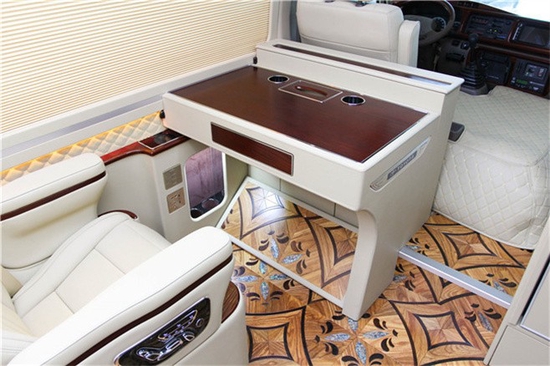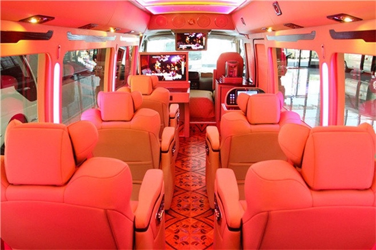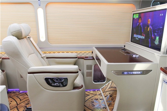 A380加装多彩灯光,我们可以先择自己喜欢的色调,清晰典雅的淡蓝色,温馨柔和的粉色让整个车厢充满着温馨舒畅的氛围,丝毫没有商务旅途的压力。或许商务旅行中我们总在考虑自己前往的目的,考虑着自己在旅途之中会有的疲惫。然而改装之后的丰田考斯特豪华商务车,却给了乘客一种轻松舒适之感。当然,我们的设计不仅仅只是体现您的高贵身份,更是为了给给您的商务旅途带来方便,因此在设计上我们更考虑了您在办公中的所有需求。在车顶处添加LED灯,方便您在旅途中观看书籍或者工作材料。高档办公桌双人汇报新,并且配备了方便的电脑以及手机充电接口,方便而又安全。